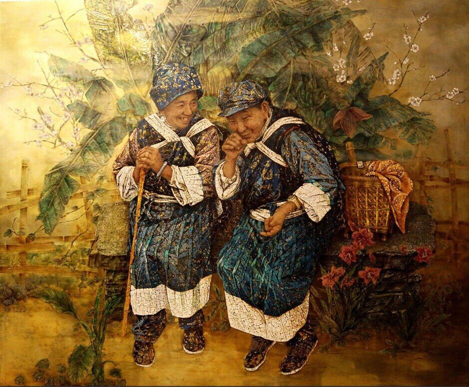 蘇國(guó)偉漆畫作品與其說是現(xiàn)實(shí)摹寫圖,毋寧說是浪漫唯美詩。無論是都市時(shí)尚女性(作品《艷冬》),還是被太陽曬的黝黑黝黑的惠安女(作品《夢(mèng)》)、抑或是過早刻上歲月風(fēng)霜的老婦女(《東家長(zhǎng)*西家短》),你都能透過畫里捕捉到人物眼里寧靜祥和的滿足感。而這樣的美好是用漆彩斑斕的大片暖色調(diào)編織的,是漆畫所特有的絢麗。