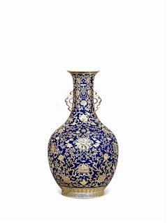 更為難得的是,拍品大多來(lái)源有序,更有出自暫得樓、玫茵堂、仇焱之等收藏大家的舊藏。比如,元青花纏枝牡丹鳳紋獸耳罐,此器原為玫茵堂舊藏,釉質(zhì)滋潤(rùn)肥厚,豐富多變的紋飾使得整器秀美精致又大氣磅礴,青花呈色濃重,略顯灰暗,為典型的元青花大型珍品;清乾隆霽藍(lán)釉描金蓮?fù)邪藢毤y如意雙耳賞瓶,為收藏大家仇炎之舊藏。