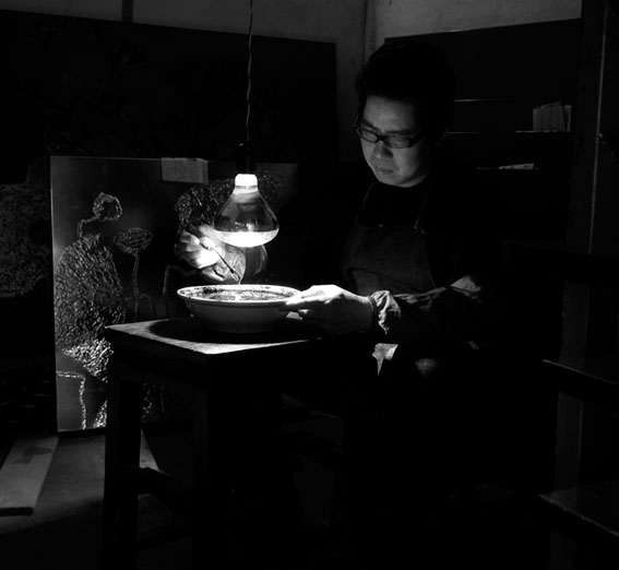 中層繪制起著承上啟下的作用,總體效果的把握、漆層厚度、肌理的凹凸、金銀的實施是中層的重點。